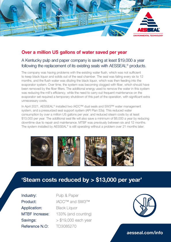 A Kentucky pulp and paper company is saving at least $19,000 a year following the replacement of its existing seals with AESSEAL products.